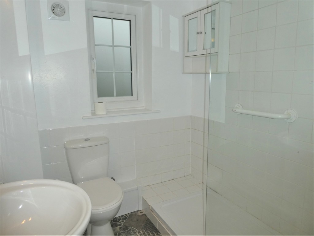 SHOWER ROOM part tiled and having large walk in shower cubicle, low level wc and pedestal washbasin, window to front