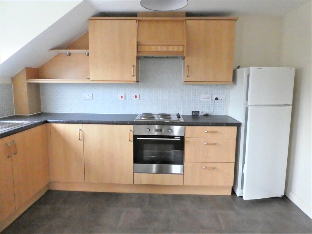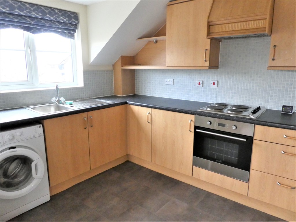 Kitchen 11'6 x 7'9 having range of wall and floor mounted units with worktops over, integrated oven and ceramic hob, fridge freezer and washing machine, window to side