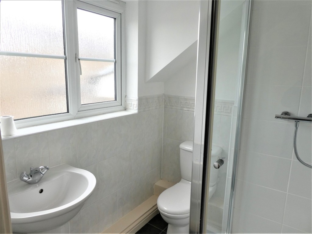 En-Suite Shower Room part tiled and having corner shower cubicle, low level wc and pedestal wash basin, extractor fan, wall mounted electric heated towel rail and window to side