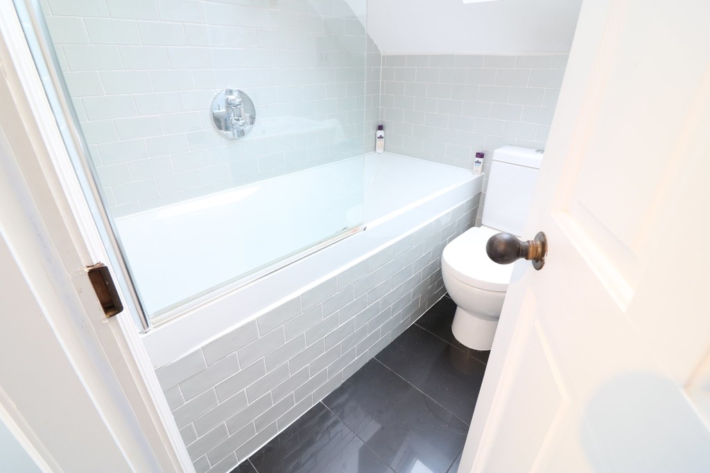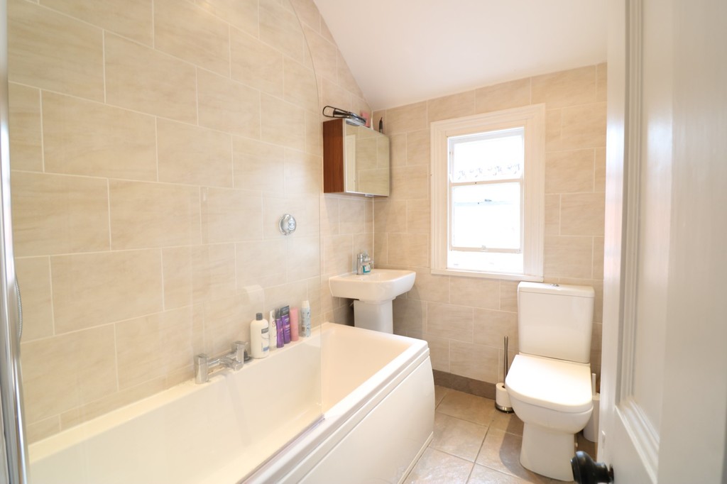 HOUSE BATHROOM with three piece suite comprising, bathroom with electric shower over, wash hand basin, wc, heated towel rail/radiator, fully tiled, window.