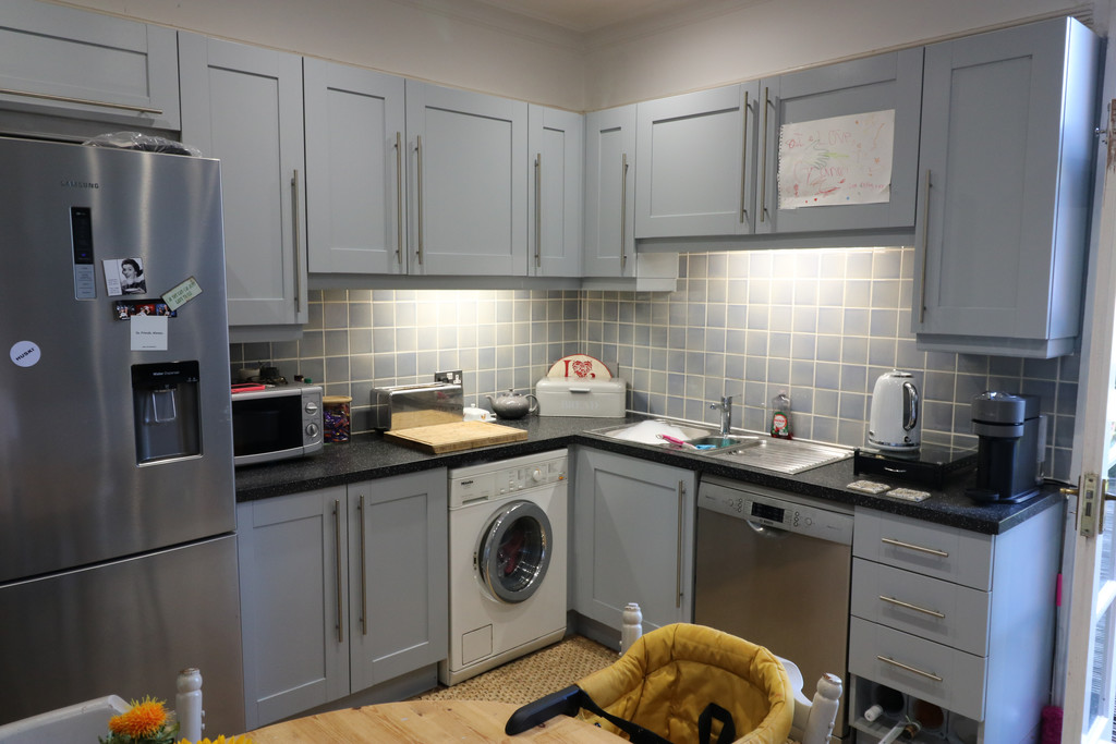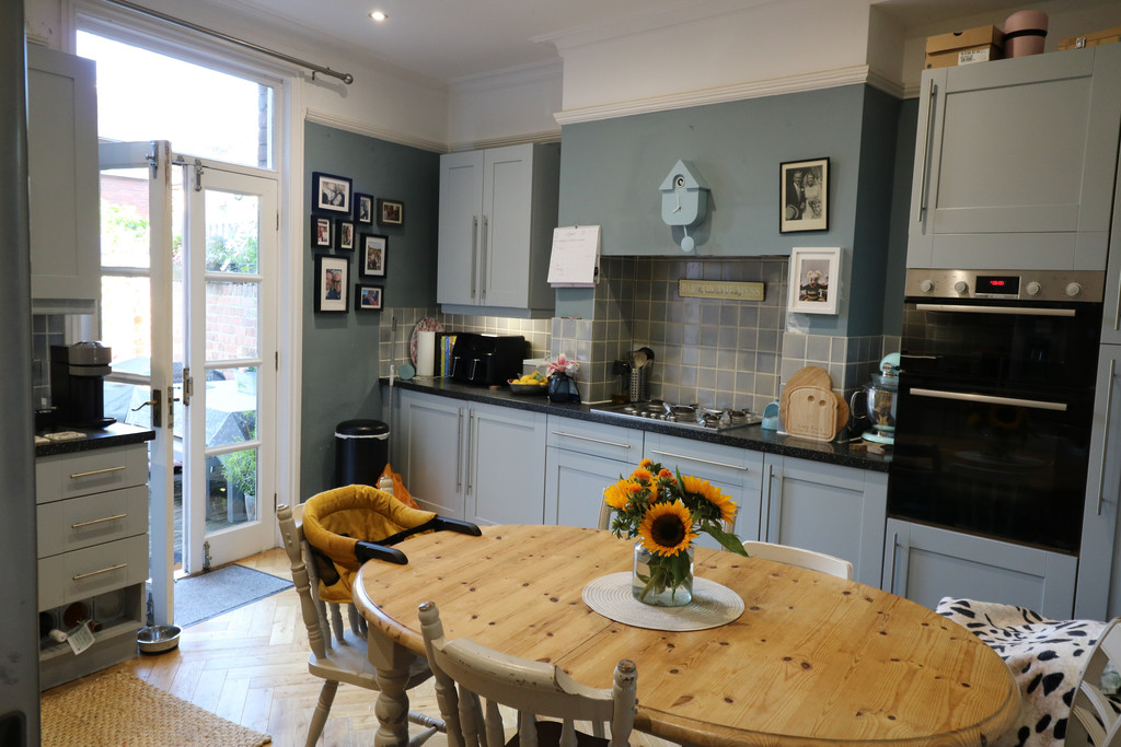 DINING KITCHEN 15' 5" x 14' 0" (4.7m x 4.27m) with fitted range of hand painted wall and base cupboards, gas hob, built in double oven, stainless steel fridge freezer, washing machine, dish waster, tiled splashbacks, radiator, double glass doors to living room. Double French doors to garden. Engineered hard wood flooring.