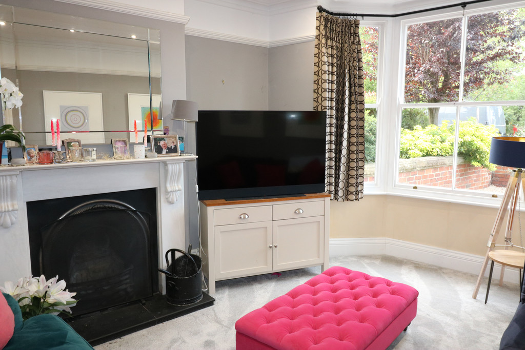 LIVING ROOM 15'' 0" x 14' 0" (4.57m x 4.27m) with bay window to front, attractive Victorian open fire with marble surround and original tiled slipe, built in cupboard and shelving to recess, radiator, tv point.