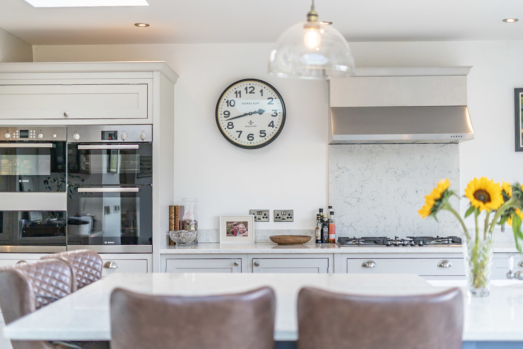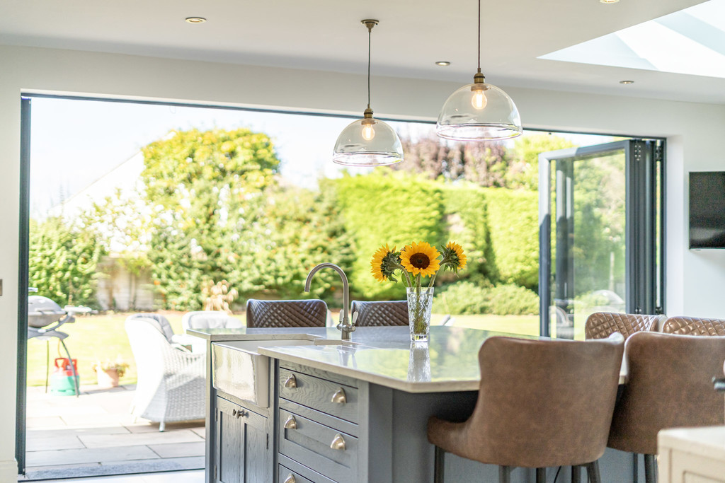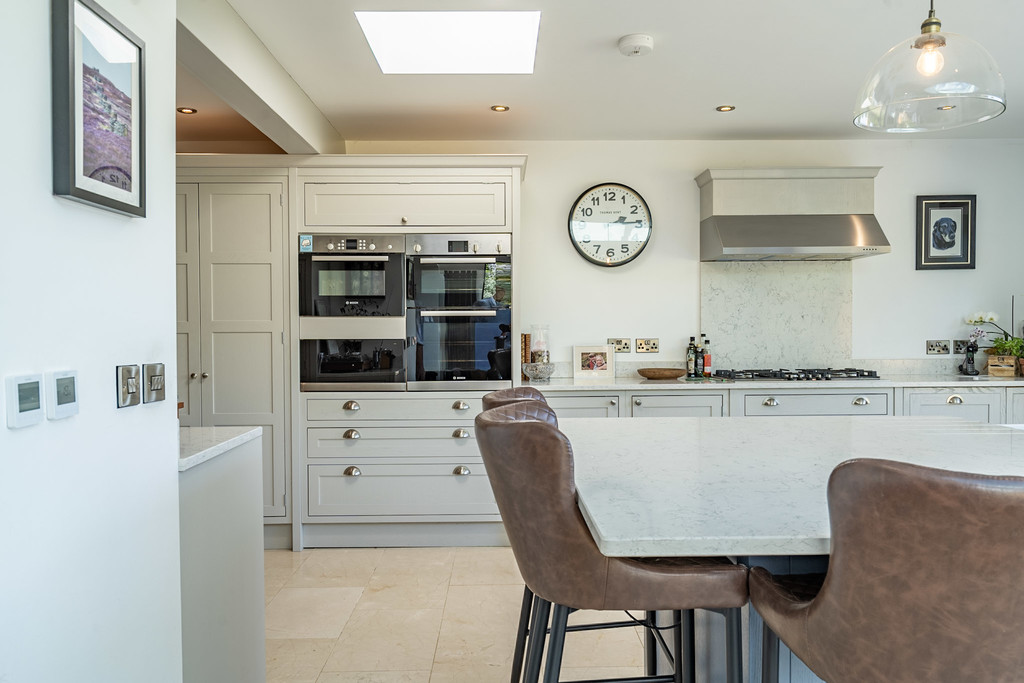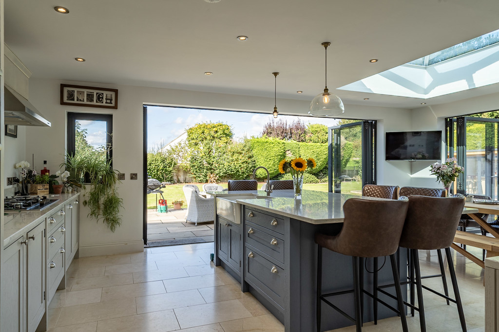 KITCHEN/DINING ROOM 28' 11" x 22' 4" (8.81m x 6.81m) with underfloor heating having a quality fitted kitchen with marble worktops by HUE Interiors of Boston Spa, having fitted units and a central island with double ceramic sink and mixer tap, gas hob, integral double oven, microwave, warming drawer and dishwasher. There are bifold doors to two sides and a roof light providing a lovely light filled room.