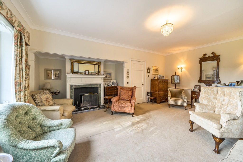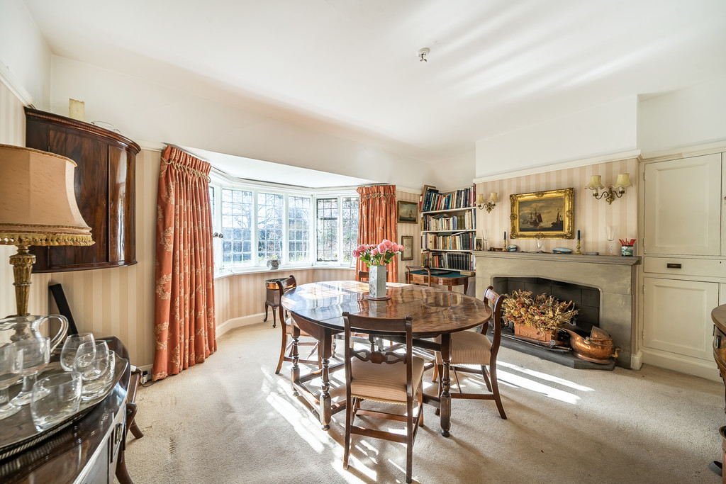 BREAKFAST ROOM A versatile secondary reception room with open fireplace and dual-aspect windows. Ideal as an informal sitting room, family snug or open-plan kitchen extension (subject to planning). Access leads to a front lobby and walk-in pantry.