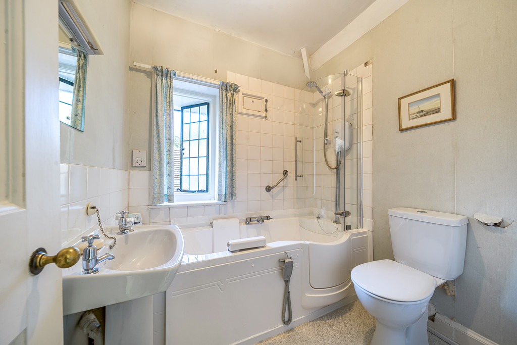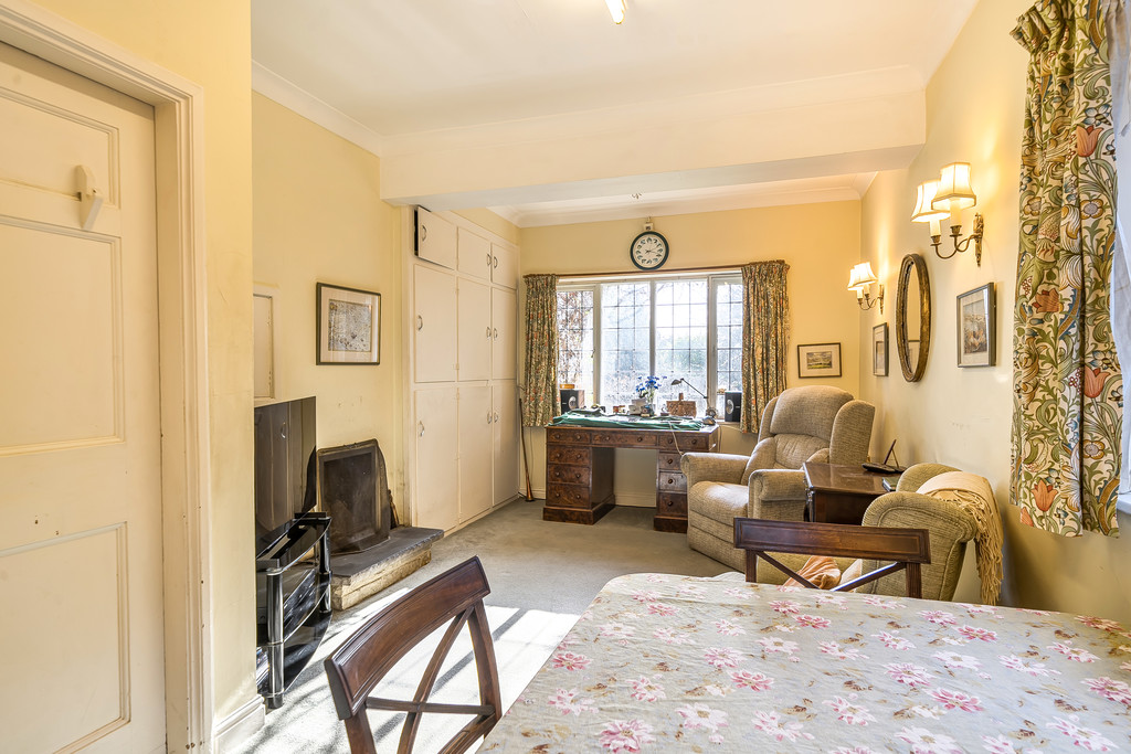 SITTING ROOM A magnificent principal reception room centred around an original Inglenook fireplace with open fire. Dual-aspect leaded-light windows, including a large bay, create a beautifully light yet atmospheric setting - ideal for formal entertaining or relaxed family living.